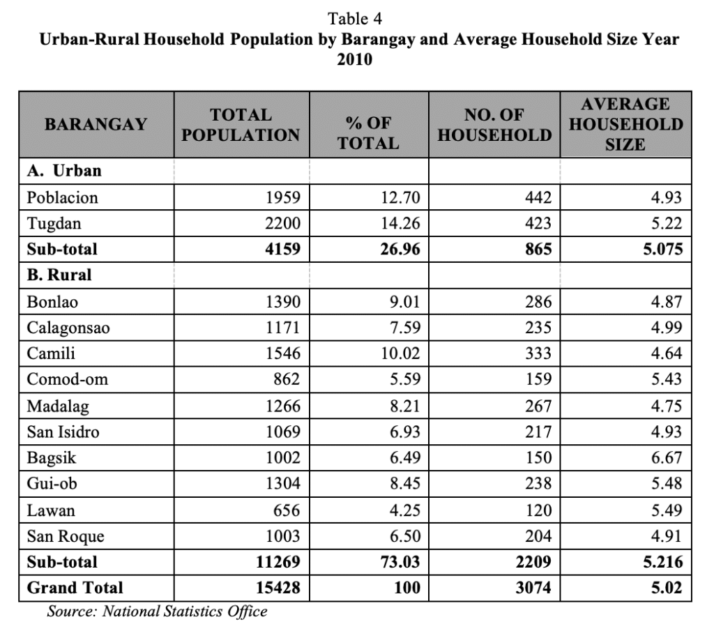 The Municipality has 2 urban barangays, Poblacion and Tugdan the rest are rural. 26.96 percent of the total population comprises the urban areas with the rest are the rural barangays.